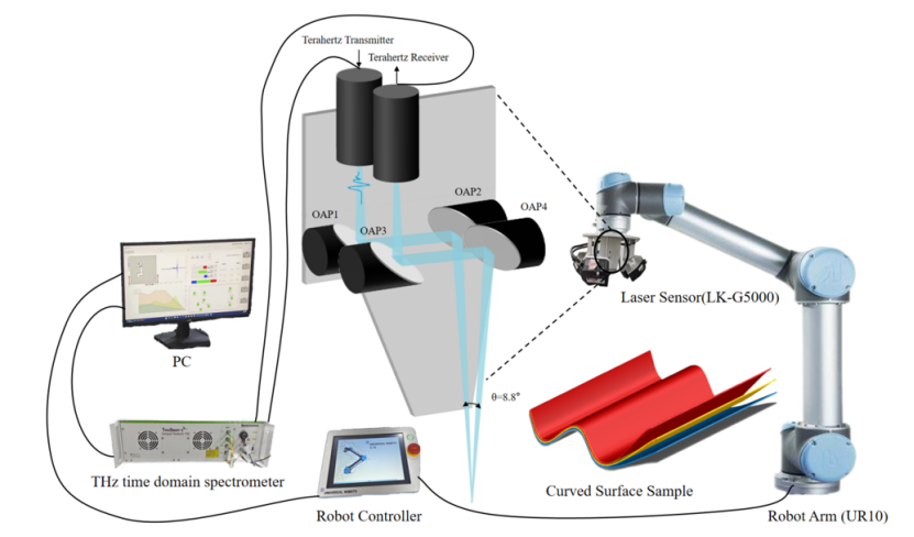 图一为机器人驱动的太赫兹光谱成像系统示意图,由计算机控制THz时域光谱仪和机器人手臂,THz光线通过光学器件引导至曲面样品上。